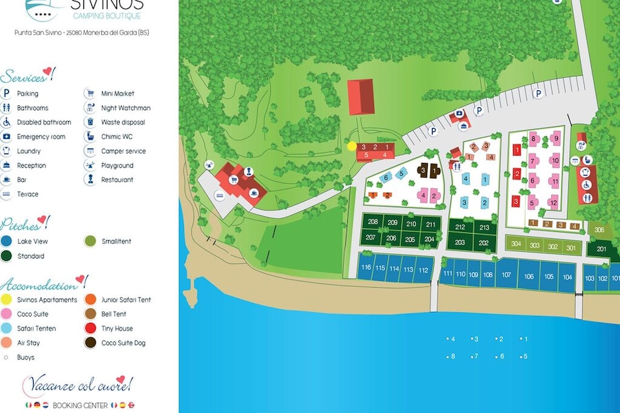 The area surrounding the campsite has a natural richness. Sivinos Camping Boutique is located between the impressive Rock of Manerba and the Punta San Sivino. The landscape on this southwest part of Lake Garda is flatter than other parts around the lake. You will find yourself in a delightful oasis at this campsite, which is perfect for relaxing. This is a perfect place for a holiday with variety, close to lively villages.Swimming in a stunning setting