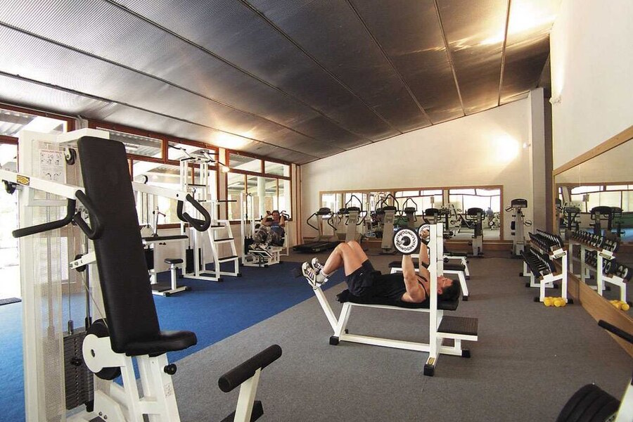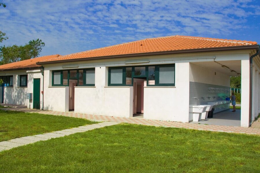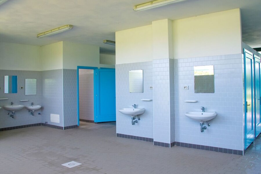 Groot en onpersoonlijk. Erg verouderd sanitair: deuren van toiletten en douches volledig rot met gaten er in. Schimmel op muren en vloeren.