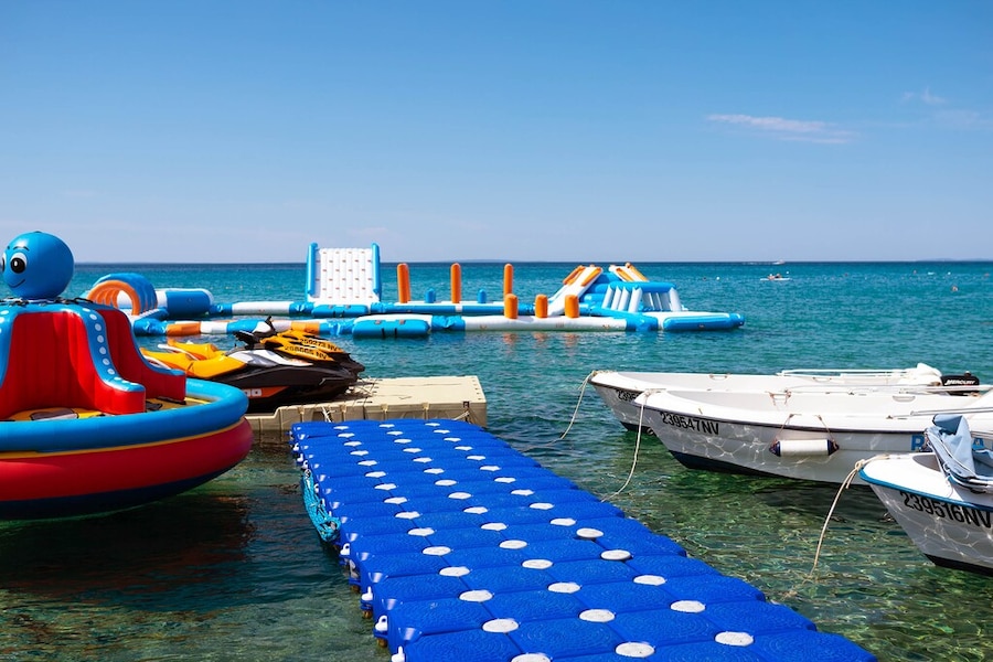 Hvis det lave vand ikke er sjovt nok, er der også en stor oppustelig borg i vandet. Efter alt det sjove i havet kan man skylle det salte vand af sig ved strandens brusere. Din hund må også gerne gå i vandet på et særligt afmærket stykke af stranden. Du kan prøve alle former for vandsport på og i nærheden af campingpladsen. Snorkling, dykning, SUP, vandski ... Du kan leje både på campingpladsen eller medbringe din egen båd. Campingpladsen har sin egen anløbsbro.